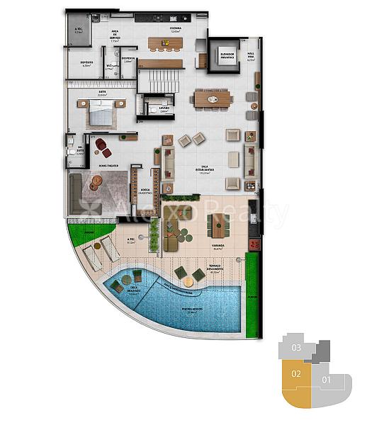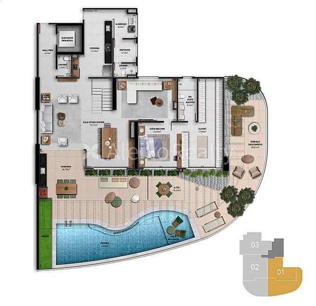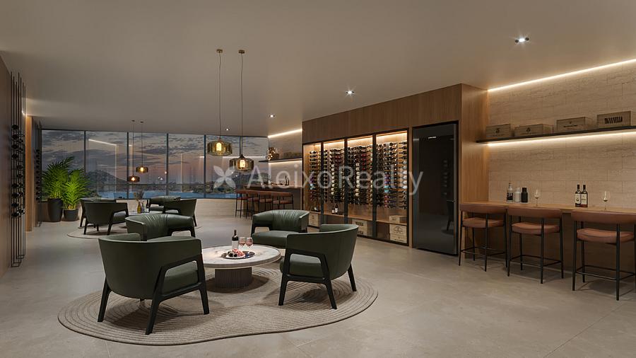 • Espaços sociais: salão de festas com duas varandas, lounge gourmet, espaço gourmet com churrasqueiras, mirante, praça central, pool bar, restaurante, coworking e sala de beleza.