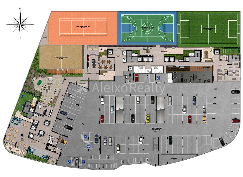 • Esportes: quadra poliesportiva, futebol society em grama sintética, tênis de saibro, beach tennis.